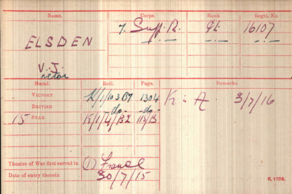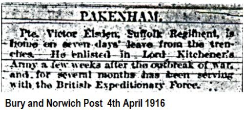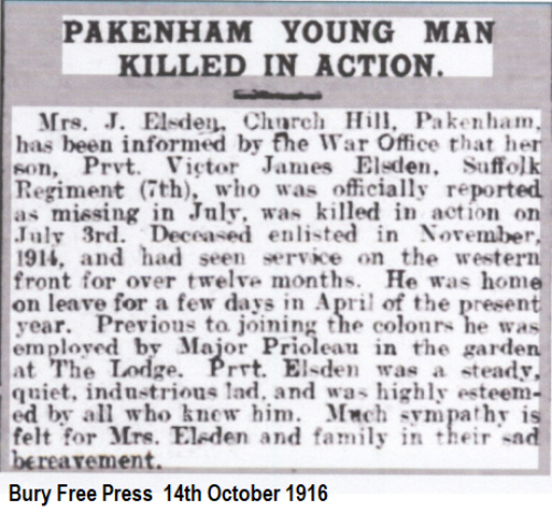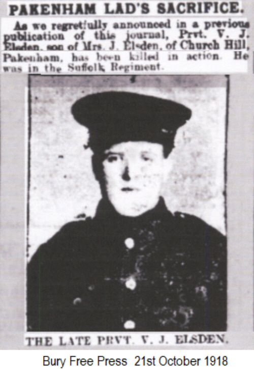 Victor James Elsden was born in Pakenham on 31st August 1892 (4th qtr 1893 Thingoe 4a:725 ), son of James and Martha ELSDEN (née DEW).