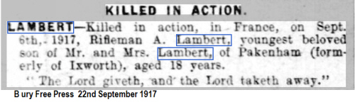1901 census...Aged 2, he was at Ixworth Road, Ixworth Thorpe with his father Henry LAMBERT [40] farm yardman born Cockfield; his mother Alice [40] born Denham; sister Ellen [12] born Cockfield; brothers John [10] born Cockfield, Henry [8] born Rattlesden, Frederick [6] born Ixworth Thorpe and Frank [4] born Ixworth Thorpe. 1911 census...Aged 12, he was at Barrack Row, Ixworth with his parents ( father cowman); sister Ellen (nurse); brothers John and Frederick both farm laburers and Frank (chemist's errand boy). On the pension card his mother was at 4 Upper Farm, Back Road, Brightlingsea, Essex. After her death father was at 48 Beche Road, Colchester. The family moved to Pakenham after 1911. |