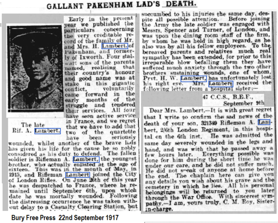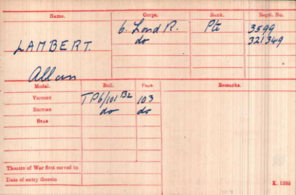 Allan Lambert was born in Bridgham, Norfolk (1st qtr 1899 Guiltcross 4b:254), son of Henry and Alice LAMBERT (née WHATLING)