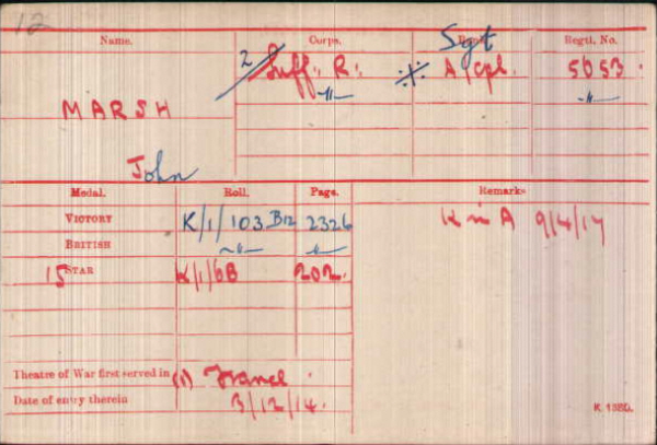 1891 census...Aged 8, he was at The Street, Pakenham with his father John MARSH [36] farm labourer; his mother Louisa (recorded here as Laura) [30]; sisters Mary [12], Laura [6] and Elizabeth [5]; brother James [10]. All were born in Pakenham. 1901 census...Not found in this census. His Army number suggests he may have enlisted for a short term in the Suffolk Regiment sometime in 1900. His parents were still at The Street, Pakenham with his brother James (stock man on farm), Reggie [8] and Howard [5]; sister Catherine [9 months]. 1911 census...Aged 23, a labourer, he was at The Fen, Pakenham with his parents (father now a blacksmith's striker); sister Elizabeth and Kate; brothers James, Reginald and Edward (all jobbing labourers). His mother had lost 6 of her 13 children. On the pension card his mother was at The Fen, Pakenham |
