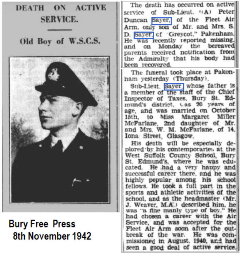 He was listed as Temp Sub Lieutenant (A), Pilot, (HMS Kestrel) on 17th February 1941. 13th March 1941 he was with 756 Squadron. 832 Squadron was formed in April 1941 at Lee on Solent as an Albacore torpedo bomber spotter reconnaissance squadron. Embarked on HMS Victorious in August 19141, carrying out attacks on shipping off the Lofoten Islands and Bodo in Norway. Peter was the pilot of Fairey Albacore Mk1 of 832 Squadron, Fleet Air Arm, from H.M.S. Victorious, which was on a navigational training flight when it suffered engine failure, crashing off the island of South Rona, east of the Isle of Skye (one report has North Rona which is many miles away, isolated in the Atlantic, well north of Stornaway). All three crew were killed, only Peter's body was recovered. They were Pilot - Sub Lt(A) Peter Duncan SAYER; Observer-Sub Lt (A) Albert HOPKINS; Air Gunner - Ldg Airman(TY) Norman WELDON.