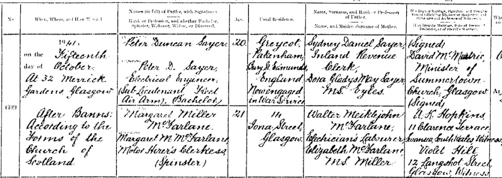In the 1939 register his parents were at "Greycott", Pakenham, father an Inland Revenue officer. Two closed records, one of which could be Peter's sister. He married Margaret Miller McFarlane of 14 Iona Street, Glasgow at Summertown Church, Glasgow on 15th October 1941