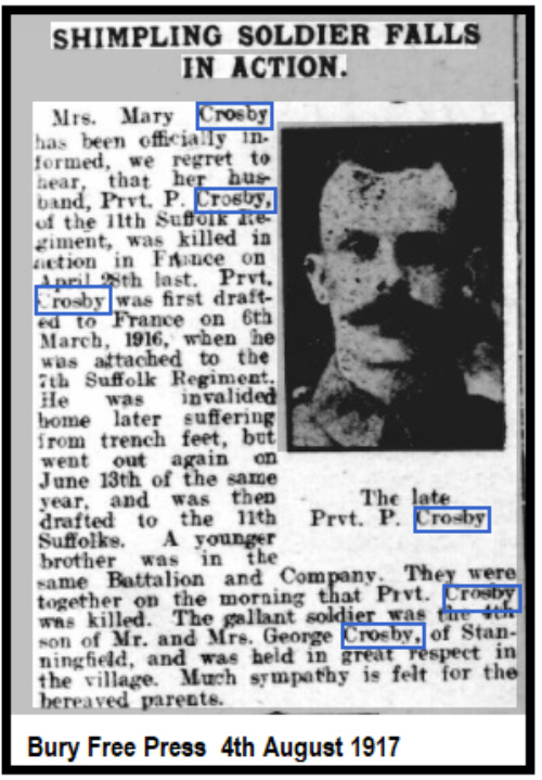 Patrick Crosby was born in Stanningfield in 1886 (3rd qtr 1886 Thingoe 4a:676) son of George and Margaret CROSBY(née GOOCH)