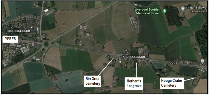 Initially buried in a small cemetery at what is now KRUISKALSIJDE along the Menin Road, he was re-interred in nearby Birr Cross Road in January 1919