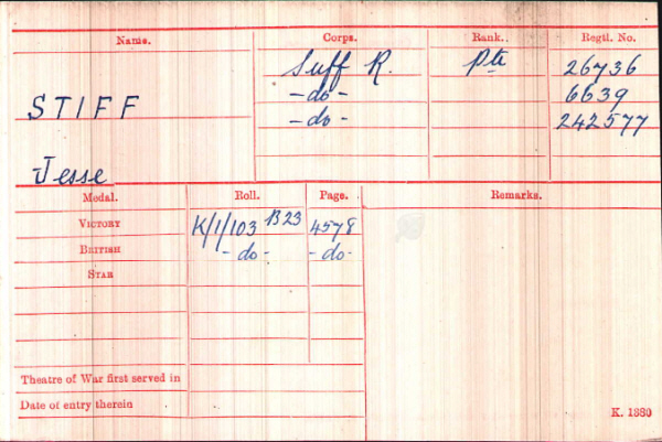 Jesse Stiff was born in Brockley (3rd qtr 1888 Thingoe 4a:666) son of Alfred and Georgianna STIFF(née RUTTER)