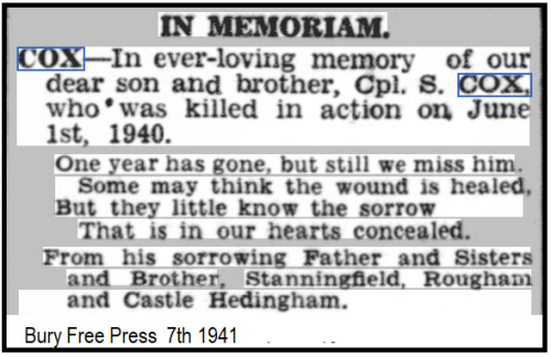 Sidney Charles Cox was born in 1914 (2nd qtr 1914 Stow 4a:1836) son of COX (née PIPER).