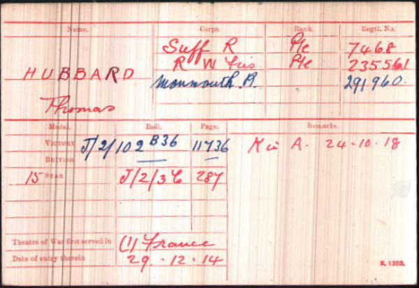 His medal card indicates that his last unit was the Monmouthshire Regiment No.291960, but they came after the East Surrey which are not mentioned. He attested first for the militia, 3rd Suffolk on 15th March 1907, giving his age as 23 years 4 months, born Thorpe Morieux, residing in Ccckfield. He enlisted on 7th June 1908 in Bury St.Edmunds for the Special Reserve, giving his age as 24 years 5 months, born Thorpe Morieux, Suffolk, a single labourer. 5 feet 8.5 inches tall, chest 33 to 36 inches, weighing 126 lbs, brown eyes and hair, Church of England. Next of kin, his father David of Cockfield. A reference was signed by Joseph Cornish of the Kings Head, Cockfield Posted to 3rd Bn Suffolk Regt, No.7468. Re-engaged in Suffolks on 19th June 1912 for further 4 years. Transferred to 2nd/5th East Surrey Regiment(No.5960) on 28-11-1916. and then to 2nd/3rd Monmouthshire Regt (date not readable). He received a £15 bounty on 4th April 1918 when it seems he moved to the Royal Welsh Fusiliers. He served at home from 7-6-1908 to 26-12-1914. BEF from 27-12-194 to 16-4-1916, home 17-4-1916 to 22-7-1917 and BEF from 23-7-1917 to death in Italy. All very muddled, but this the problem with the burnt documents, not even sure at times if all the scraps of paper are actually for the same man. In this instance the regiments seem mixed up and he is recorded as dying in France, but CWGC have him dying in Italy which is where the 1st Battalion were serving. The main thing is having the right civilian. His connection with Stanningfield is tenuous, but his father and stepmother were there in 1911 . Nothing found to indicate when the surname change took place. The switch of given names can also cause confusion with a Thomas Charles HOWE of the same age, who survived the war.