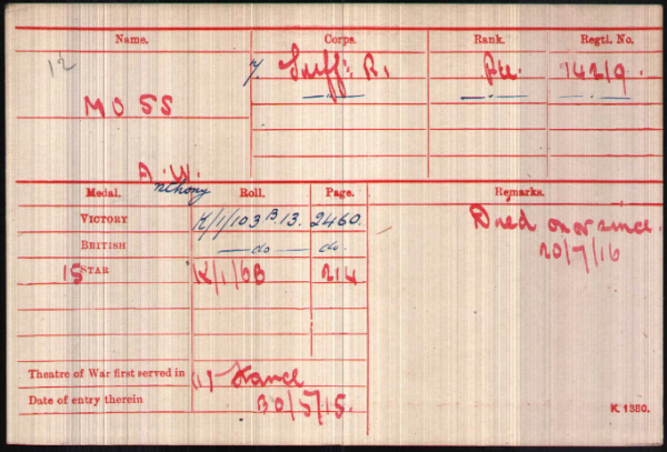 Anthony William Moss was born in Lawshall (3rd qtr 1892 Sudbury 4a:719), son of Alfred and Emma MOSS(née LOCK)