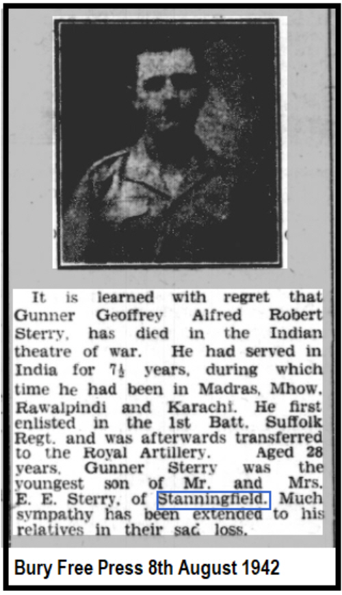 Geoffrey Albert Robert Sterry was born in 1914 in Stanningfield (1st qtr 1914 Bury St.Edmunds 4a:1752) son of Ernest Edward and Kate Mary STERRY (née ATKINSON )