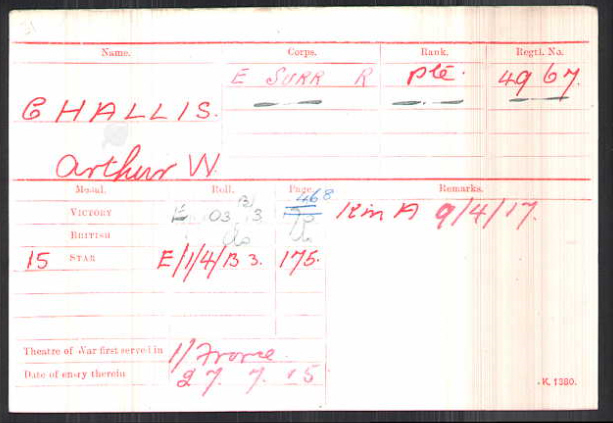 Arthur William Challis was born in Castle Camps (Linton Q4-1892 3B:477), baptised in Castle Camps on 4th June 1893, son of Frank and Mahala CHALLIS (née MYNOTT). 1901 census...Aged 8, he was at 17 Clements Lane,Haverhill with his father Frank CHALLIS [43] labourer born Haverhill; his mother Mahala [42]; sisters Lily [17], Nellie [13] and Dorothy [3]; brothers Walter [11] and Frank [10]. All except his father were born in Castle Camps. 1911 census...Aged 18, a marine and store dealer helper was at Calford Green, Kedington with his parents; brothers Walter James and Frank (both marine and store dealer helpers); sister Dorothy Annie. His parents were later at 5 SnapesYard, Haverhill. So far the connection with Shudy Camps is not known. |