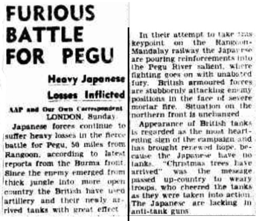 Newspaper report on 9th March 1942, but Rangoon was evacuated and then occupied by the Japanese (7th March) by the time this was printed