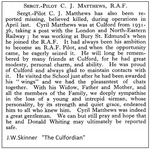 Educated at Culford School. On Christmas Day 1940, in Bury St.Edmunds Cathedral, he married Dorothy JACKAMAN. In the 1939 register, at 76 Newmarket Road, Bury St.Edmunds were Cyril (a railway clerk/ special constable), father Arthur J [4-12-1889] a golf professional; his mother Lily [8-3-1890] and brother Roger D [14-5-1923] a fitter's mate. There are two closed records (sister Louis would be one, she died in Australia in 2013). It is not known where his brother George was. His brother George Kenneth died serving in the RAFVR in 1943 see here |