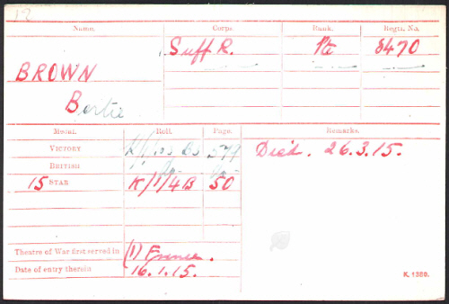 He enlisted in Haverhill, from his number, in about 1912. He was in France by 16th January 1915, before moving on to the Ypres Salient