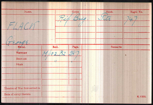 1911 census...He seems most likely to be the George Flack with the 2nd Bttn. Rifle Brigade in India (Age given as 24, born Cambridge). His regimental number puts him as enlisting around 1905. At the Brickyard, West Wickham were his parents and brothers Albert, Aleck, Walter ( all farm labourers) and Frank (scholar).