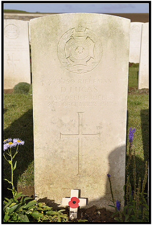 Without his service records and dying of his wounds it is impossible to be sure of where and when he was wounded. His battalion were involved around Bourlon Wood at the time. The Cambridge Independent Press of 11 January 1918 had:- "Mr and Mrs Charles Lucas of Whitehall Cottages have received news that their eldest son, Rifleman Dennis Lucas, City of London Regiment, was killed in action on December 2nd 1917. He leaves a wife and two little children. He had been living in London for several years before joining the Army. Their youngest son Pte H (Harry) J(John) Lucas of the Suffolks was wounded severely on October 13th 1917. His left leg has been amputated but he is now progressing favourably in hospital in Brighton."
