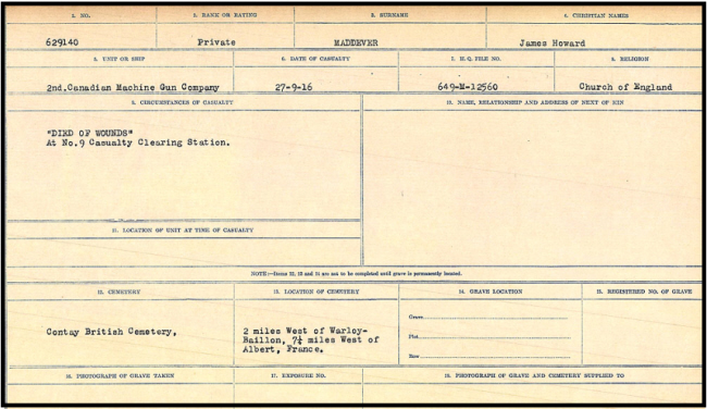 Initially he was in the 47th Battalion, Canadian Infantry and sailed on 13th November 1915, arriving UK on 23rd via SS "Missamabia" and going to Bramshott. From there he was posted to 32nd Battalion at Shornecliffe. Whilst at Shornecliffe he went down with German measles and spent 12th March to 7th April 1916 in Moore Barracks, Canadian Hospital. He then joined 30th Battalion on 9th June before transfer to the Canadian Machine Gun Depot on 232rd June Shipped to France on 11th July, he was taken on strength of 2 Machine Gun Company on 14th July. Wounded at place unrecorded on 26th September he was admitted on 27th to No 9 Casualty Clearing Station where he died that same day. Canadian records show that his widow re-married to ASPINALL, 35 Manchester Road, New Cleethorpes, Grimby. (John ASPINALL married Florence MADDEVER Grimsby Q3-1919).