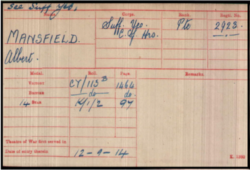 Albert Mansfield was born in West Wickham (Linton Q3-1894 2B:475) son of William and Elizabeth MANSFIELD (née HOWE). He was baptised a Primitive Methodist on 15th October 1894.