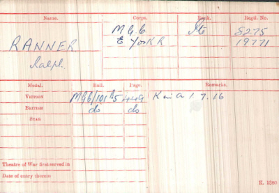 Ralph Ranner was born in Ashley cum Silverley in 1897, (Newmarket Q2-1897 3B:502) , baptised in Ashley cum Silverley in 1897, son of Thomas Ernest and Mary