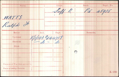 1901 census: Aged 2, living at High Street, Burwell with his father- Grimmer WATTS [31] baker/grocer born Lakenheath; mother- Rebeka [31] born Lakenheath; brother- Arthur W [4] born Lakenheath; brother Albert G.B. [10 months] born Exning, and Ethel FINCHAM, a visitor (born Nottingham). His mother had been registered at birth as Albina Rebecca FINCHAM. 1911 census: Aged 12, living at High Street, Burwell with his parents, brother Albert and 5 sisters, all born in Burwell; Hilda Maud [9], Mildred Doris [7], Eva Rebekah [6], Amy Hannah [5]and Freda Ethel [3] and a brother Reginald Frank [8 months]. Brother Arthur had died. It appears Ralph's only Lakenheath connection was it being the birthplace of his parents |