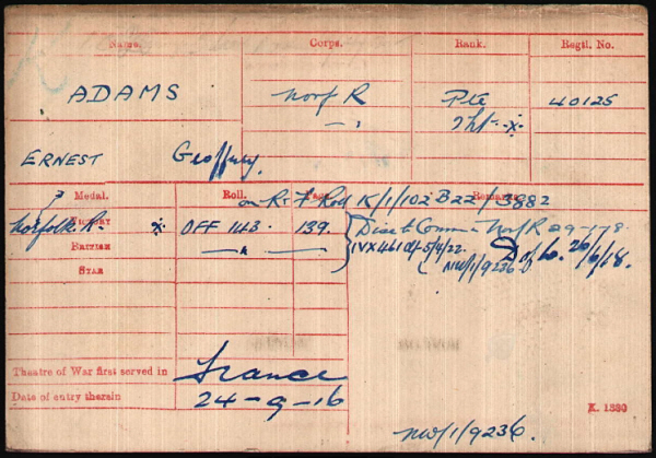 Born in 1897 (Qtr 2 Bedford 3b:332), son of Ernest William and Hester Alice ADAMS (née GRAY). Baptised in Bedford All Saints, 2nd May 1897.
