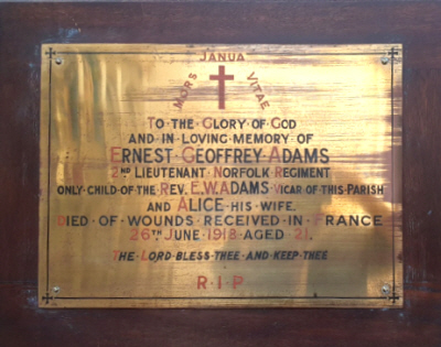 1901 census...Aged 4, he was at 51 Hurst Grove South, Bedford, with his father Ernest W ADAMS [38] C of E Clergyman, born Surbiton and his mother Hester A [36] born in India 1911 census...Aged 14 he was at St.John's Vicarage, Bury St.Emunds with hsi parent. Mother's birth now recorded as Coonoor, Madras, India Educated at King Edward VII Grammar School, Bury St.Edmunds, then Peterhuse College, Cambridge. Member of Offce Cadet Battalo. Enlisted as Private in Canbrideshire Regiment before commissiioning in to the Norfolk Regment |