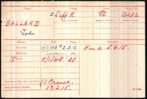 John Ballard was born in Cavendish (Sudbury Q3-1889 4A:639), son of Charles and Eliza BALLARD (née BROWN) CWGC have his mother as Ada, but this appears to be a typo, his Army records show Eliza as do all the census. 1891 census...Aged 1, he was at High Street, Cavendish with his father Charles BALLARD [40] gardener's labourer; his mother Eliza [38]; sisters Lissie [13], Ada [8] and Kate [4]; brother Harry C[6]. All were born in Cavendish 1901 census...Aged 11, he was still at High Street, Cavendish with widowed mother Eliza; brothers Harry (farm labourer) and William [9]; sister Edie [5]. The new siblings born in Cavendish. 1911 census...Aged 21, general labourer,he was "near the Church", Cavendish with his mother; sister Ada, brother Harry ; niece Olive Tonkin [5] born Erith, Kent (parentage unknown). The pension card has his mother Eliza at Church Corner, Cavendish. His brother William was killed serving in Belgium in the Suffolk Regiment earlier in 1915 see here George Argent, John Ballard, John Brown, Jack Johnson, Charles Slater, Frank Underwood and Arthur Wells, from their numbers, seem to have all joined the Suffolks on the same day |