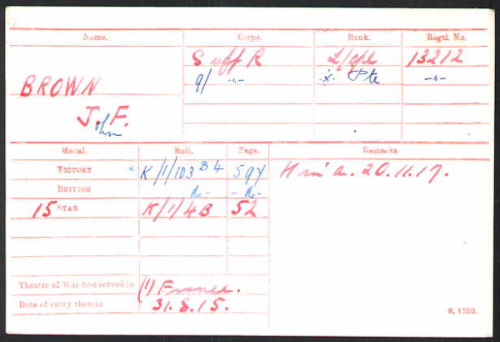 His father had in 1887 married Cavendish born Maria THOMPSON, their daughter Letitia born 3rd May,1889 in Cavendish. Maria died in 1897. His mother had married Samuel FINCH in 1884, he died in 1890 and she married William BROWN in 1898 1901 census...Aged 7 he was at High Street, Cavendish with his father William BROWN [39] maltster; his step mother Elizabeth [37] born Foxearth, Essex; half brothers Bertram FINCH [15] blacksmith and Alfred G FINCH [14] and Arthur W BROWN [1]; sister Letitia O [11]. All except his mother were born in Cavendish 1911 census...Aged 17, a gardener's lad, he was at Maltings Yard, Cavendish with his parents; half brothers Alfred George FINCH(postman), Arthur William and Robert Victor [9]; half sisters Anna Elizabeth [7] and Edith Emma [5]. The new siblings all born in Cavendish. George Argent, John Ballard, John Brown, Jack Johnson, Charles Slater, Frank Underwood and Arthur Wells, from their numbers, seem to have all joined the Suffolks on the same day |