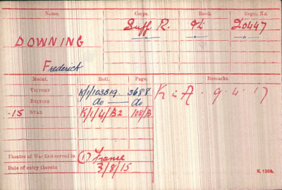 He enlisted in Newmarket. On April 8th, 1917 the 11th Suffolks were moved to Roclincourt and on the 9th at 5:30 am they attacked the German lines as part of the 1st battle of the Scarpe (9-14 April). Checked but not delayed by machine gun fire they reached their first objective, Black Line, with no losses. Just after 8am they moved on to the German second line, where they established battalion HQ, capturing 20 prisoners in the process. They then consolidated their position. Their losses for the day were 24 of which only Frederick and seven others have no known grave. The Bury Free Press of 3rd November 1917 reported CHIPPENHAM MAN KILLED IN ACTION Official information has been received by the relatives of Prvt Frederick Downing of the 11th Suffolk, that he was killed in action or died of wounds on or shortly after April 9th, 1917. Some weeks back they were informed that he was wounded and missing. |