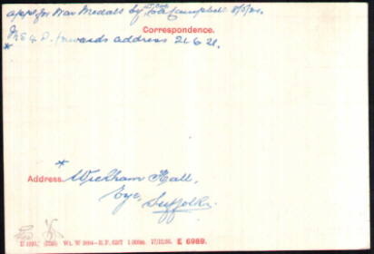 At probate his will has his address as Gothic House, Clare,Suffolk. From the medal index card is appears his father, by 1923, had moved to Wickham Hall, Eye.