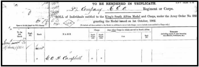 1901 census...Aged 21, he was in South Africa in the Royal Garrison Artillery. As 2nd Lieutenant, he left Tilbury on 28 Apr 1900 on the Orotavia, and returned from Durban on the Nubia on August 5th 1902.