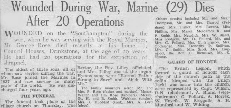 George Ernest Rose was born in Drinkstone on 30th December 1918 (1st qtr 1919 Stow 4a:1205), son of Philip Walter and Alice Mary ROSE (née SMITH). He was the middle of 3 brothers. His mother was a Rattlesden girl. George entered Drinkstone School in 1923. Their house, once 5 Council Houses, Gedding Road, is now Number 16 Gedding Road. This is where the family were for the 1939 Register His father Philip Walter ROSE (senr) farm labourer [3-11-1881], his mother Alice M.[4-7-1891]; Philip W junior [30-3-1917, James N.[28-6-1921]. Also there was Arthur N.CLAISSE [20-10-1928] (possibly an evacuee?) There is one closed record. |