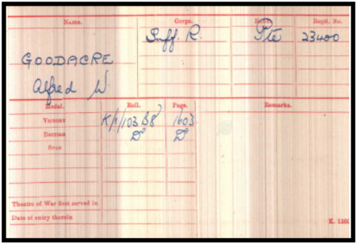 Three of his siblings were baptised in April 1887 at St Mark's in Camberwell, Charles James, Minnie Rose, and strangely a son named Alfred William. This Alfred probably died in 1888 aged 1 yr and when our Alfred was born in 1890 the parents named him after the child they had lost, a not uncommon procedure in those days. 1891 census...Aged 1, he was at Rolls Road, Bermondsey with his father George GOODACRE [40] farrier smith, born Saffron Walden; his mother Alice [40] born Saffron Walden; sisters Louisa M [14], Alice A [13], both born Horton, Middlesex, Minnie R [6] born Bermondsey and Ethel M [2] Camberwell and brothers Frederick G [12] born Horton, Middlesex, and Charles J [7] born Bermondsey. 1901 census...Aged 11 he was at Station Road, Dullingham with his uncle William SEELEY [49] farm labourer, born Dullingham and aunt Susan [51] born Saffron Walden. On 29th March 1910 he enlisted in Newmarket in the Grenadier Guards # 14607. At his medical he gave his age as 20 years 2 months, occupation farm labourer. He was 5ft 9 3/8 inches (176.3 cm) tall, weighed 158 lbs (71 kg), chest 36.5" to 38" (92.7 to 96.5 cm), with hazel eyes and light brown hair. He gave his next of kin as his mother Alice, of 19 Westville Road, Shepherds Bush, which suggests his father had died. Joining the Guards at Caterham on 2nd April he seemed not to be of the Guards standard, since he was discharged on 26th April 1910 as being "inefficient". 1911 census...Aged 21, a farm labourer, he was at Church Lane, Dullingham with his uncle and aunt, William and Susan SEELEY. The last address for his family is given as Flackwell Heath. His sister Ethel May Goodacre died in the district in 1973 aged 85yrs. There is also an Alice Goodacre who died in 1932 aged 80yrs in the Wycombe District, this could be his mother. The pension card names his uncle William Sealy, of Church Lane,Dullingham.