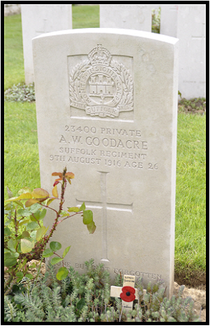 He enlisted in Newmarket. "Soliders Died" has him born in Dullingham which may be understandable since he spent most of his life there with his uncle and aunt . On 8th August 1916 the Germans had taken 70 yards of Ration Trench (west of Pozières) but this was regained by the 7th Suffolk who gained a further 200 yards of the trench. Only 5 are recorded as killed on the 8th by CWGC so it may be that the 51 recorded killed on the 9th represented many of the missing from the roll call taken on 9th. Alfred was one of only 7 with an identified grave. |