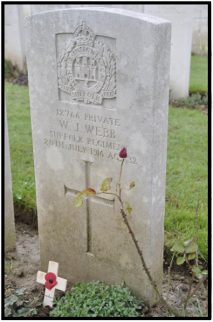 Enlisted in Newmarket . The 2nd Battalion, Suffolk Regiment were nearly wiped out in the attack on Longueval on 20th July 1916 in the battle of the Somme. Despite their right flank being exposed they pressed on. Heavy mist caused the second line to lose direction. Machine gun fire from the junction of Duke Street and Piccadilly made movement impossible and they had to dig in along Duke Street until relieved. Only 25 of the 114 dead have identified graves. William was brought into Caterpillar Valley Cemetery in December 1920 from either the battlefield or one of the smaller cemeteries that were being concentrated after the Armistice. His "Soldier's Personal Effects" record has sister Anna DODD as sole legatee. |