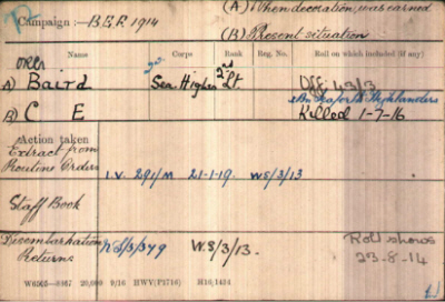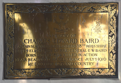 amongst others, at Kelloe, Edrom, Berwickshire, and Forse, Caithness and Exning House. 1901 census...at Exning House were Charles Edward [6] with parents and sisters Rosemary F [5],born London.... Millicent I [3], born Exning.... and Vida J [1], born Exning 1911 census...Charles was presumably at Eton College. At Exning House were his parents, sisters Millicent Irene and Vida Jane, brothers William Stanley [7], born Exning....David Everard [4] , born Exning. His father had a number of houses throughout Scotland and more than one in England. Charles seems to be commemorated in all four quarters of Scotland as a result. His father had applied for his 1914 star but shown by his medal index card, he arrived in France 1 day too late. He was wounded by a bullet in his upper right arm on 13th October 1914 at Fletre, 10 kilometres north-east of Hazebrouck, on the Belgian/French border. The Seaforths suffered 18 killed, 66 wounded and 1 missing that day. He was evacuated home and from 20th October spent some time in Lady Mountgarret's Hospital for Officers, 18 Cadogan Gardens, Sloane Square, SW3. Returning to the front he was again wounded by shrapnel in his right leg at St Julien, Belgium on 27th April 1915. The battalion was in trenches at Wieltje, northeast of Ypres, participating in the 2nd battle of Ypres. French attacked about 12.30pm on their right. Enemy responded with heavy shelling and the Seaforths had 12 wounded. This time he was sent to the 5th Northern General Hospital in Leicester. Of this particular occurrence the Newmarket Journal of 8th May 1915 stated:- MR.C.BAIRD WOUNDED:- "We regret to hear that Mr. Carol Baird (son of Col.E.W.D.Baird) who is an officer in a Highland Regiment now at the Front, has again been wounded, being struck in the leg. He has been sent home, and is now in a hospital in the South of England." After a spell of light duties with the 3rd Battalion, he again returned to the front in August. Almost a year later he was killed in action near Beaumont Hamel on the first day of the Battle of the Somme. The Bury Free Press of 22nd July 1916 :- EXNING OFFICER'S DEATH FOR HIS COUNTRY - CAPT.BAIRD KILLED IN ACTION Deep sorrow is felt in Exning at the death of Capt.C.E.Baird, Seaforth Highlanders, who was killed in action the week before last. He was the eldest son of Brigader General and Mrs. Baird, and was born at Exning House in 1894, at which place his parents resided from the time of their marriage until four years ago, at which time the Exning Estate was bought by Lord St Davids. The deceased spent all his earlier days at Exning House........... |
