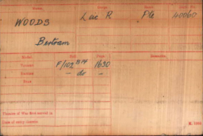 Born in Woodditton on 21st November 1880,[Newmarket 3b:529] the 2nd son of Harry and Emily A. WOODS of Ditton Lodge Farm Cottage, Woodditton. 1881 census...At 2 Ditton Lodge Farm Cottages, Woodditton were Bertram [4 months] with father Harry [28] groom on farm, born Norton, mother Emily A [28] born Newmarket, brothers Albert E [8]born Hundon, George J [5] born Disley, Cheshire, and Charles [3] born Woodditton, and sisters Kate E [6] born Norton and Emily A [3] born Woodditton and servant Eliza Everett [23]. 1891 census...At 6 Eleanor Terrace, Burwell Road, Exning were Bertram [10], his parents (father now a gardener) brothers George James [15] a waiter in hotel William [9] born Woodditton and Harry [4] born Newmarket, and his sister Emily Annie [12], Rose Miriam [2] born Exning and Maud Ethel [1] born Exning. 1901 census...At parsonage Lane, Burwell were Bertram [20] Royal Navy seaman, his parents, brother Harry, sisters Rose and Maud and brother Frederick [9] born Exning 1911 census...All that were left at home at 1 Ash Terrace, Laceys Lane, Exning were Bertram's parents, brother William WOODS ( a Reservist) and niece Katherine Elizabeth JONES [14] a nursemaid, born Fulham SW. No sign of Bertram in this census. If his time in the Navy mentioned below is correct he would not be in the Navy in 1911 which could have explained his absence. |