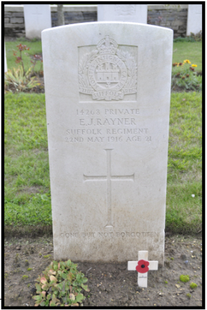 Edwin James Rayner was born in Freckenham (Mildenhall Q1-1895 4A:834), the son of Samuel W and Sarah Ann RAYNER (née PLUMMER).