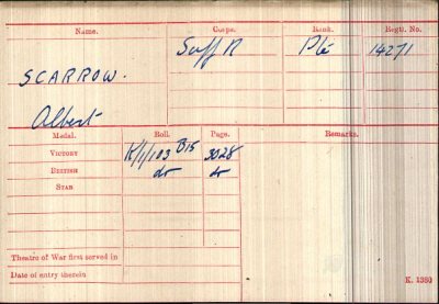Albert Scarrow was born on 4th May 1890 in Freckenham (Mildenhall Q2-1890 4A:713), son of William and Eliza SCARROW (née DORLING )