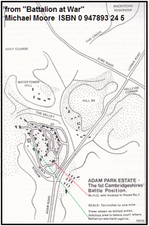 In the 1939 Register he was i the Territorials, but was then mobilised and commissioned into the Cambridgeshires. In the closing stages of the battle for Singapore, the 1st Cambridgeshires were fighting in the Adam's Park area of Singapore. On Friday 13th February they were around Hill 95. Captain Bill Gurteen took command and Lieut Bigmore took over "A" Company. By the 15th it was getting almost impossible to move between Companies due to the intense Japanese machine gun fire. Just hours before the surrender, John Bigmore, now Battalion HQ, was shot through the head and died, whilst Captain Gurteen was wounded. A detailed account of the actions of the 1st Cambridgeshires at this time is in Michael Moore's book "Battalion at War" ISBN 0 947893 24 5 |