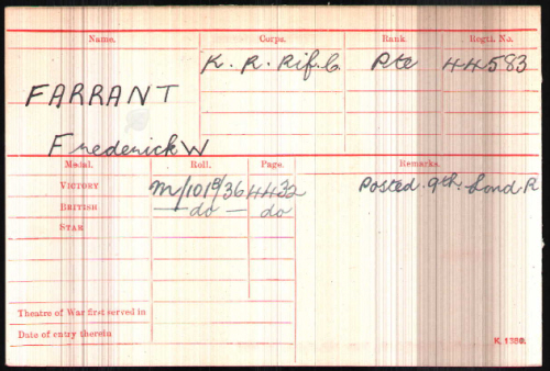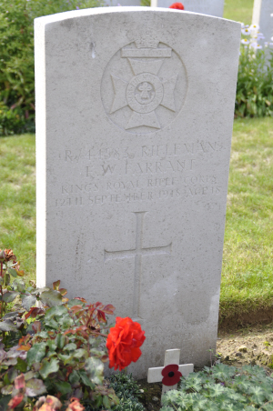The Queen Victoria's Rifles Battalion war diary has them near Epehy, having just relieved the 4th Suffolks and discharged gas on Epehy. 2nd/10th Bn on the left, 12th Bn on the right 12th Sept - Heavy hostile shelling artillery fire on Brigade front from 9:30to 10:30 am. Left Battalion's forward post rushed by the enemy and garrison scuppered ?Ill gas ?..and snipers active. Casualties 1 officer and 5 OR The South West Suffolk Echo on October 5th 1918 read:- "Mr. and Mrs. Farrant of Downs Place, Haverhill have received official notice that their son, Rfm, F.W.Farrant, of the King's Royal Rifles, was killed in action on September 12th. Deceased, who was only eighteen years of age at the time of his death, had been in the Army less than a year, and for the past six or seven months had been in France.Prior to enlistment he was employed at Messrs.Christmas and Co's Brewery. " and on 16th November :- A few weeks ago we notified the fact that Mr. and Mrs. Farrant of 1,Downs Place, Haverhill, had been notified of the death of their son Rfn.F.W.Farrant, of the King's Royal Rifle Corps. the following letters have been received:- From the Captain:- "It is with feelings of deepest regret I write to inform you of the death of your son, Rfn.F.Farrant, of this Company. He was killed a few days ago while we were in the line; a shell landed right on top of the trench he was in, and death was almost instantaneous. May I take this opportunity of expressing my appreciation of his work, his cheerfulness and courage which he has shown while in the Company". From the Chaplain:-"Captain Samuelson informs me that he has conveyed to you the sad news of your son's death, but I thought you might like to hear that I conducted the funeral in the cemetery in this quiet village. We laid him to rest sadly and reverently in the quiet valley until the day dawns and the shadows flee away. A few days afterwards I marked the graves with a very nice cross which had been constructed by this Company. May God comfort you in your affliction: |