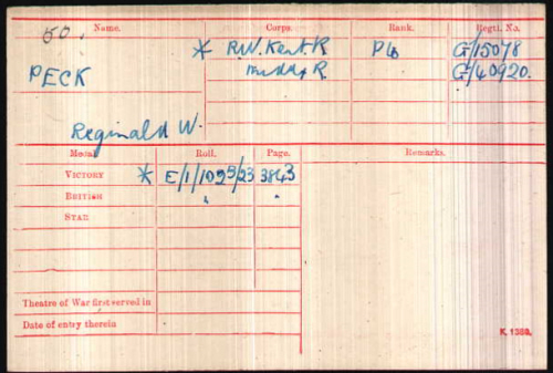 Reginald William PECK was born at 38 Hamlet Road, Haverhill on 26th July 1897 (Risbridge Q3-1897 4A:765), baptised in St Mary's, Haverhill