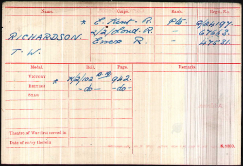 1901 census...Aged 2, he was at 6 Chauntry Row, Haverhill with his father Thomas RICHARDSON [23] farmer's son; his mother Eliza [27] and sister Ethel [1]. All were born in Haverhill. 1911 census...Aged 12, he was still at 6 Chauntry Row with his parents (father now a carter); sisters Gladys[10], Mabel [8], Dorothy [5], Freda [2] and Ruby [under one month]; brother Cyril [7]. The new siblings all born in Haverhill. All 8 sibling survive. Sister Ethel was visiting the BURCH family at 21 George Street, Chelmsford. Later his parents moved to 1 Orchard Street, Chelmsford. |