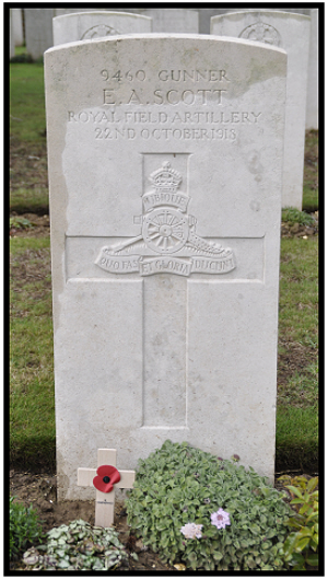 He enlisted in Holborn, London. The whereabouts of this unit at the time has yet to be found. The South West Suffolk Echo on 23rd November 1918 reported:- "We regret to record the death of another of Haverhill's young men, this time in the person of Gunner Ernest A.Scott, of the R.F.A., fourth son of Mr. and Mrs.H.Scott of 32 Mount Road. Gnr. Scott, who was 23 years of age, was killed in action in France on October 22nd. Joining up on the outbreak of war he had seen much service. During that period he has also fought in Italy. He was much esteemed by all with whom he came into contact, being of an unassuming and cheery manner. He leaves a widow, who has received the following letter from his officer, Lieut H.C.Green:- "Please accept my deepest sympathy on the loss of your husband.He was killed on the morning of the 22nd whilst on duty. I have known him personally for two years and have always found him a splendid soldier, hard working and always cheerful; he will be greatly missed by the officers, NCOs and men of the Battery, who are greatly upset by their loss, and who all send their sympathy. Your letter received today (November 11th), asking for further particulars regarding your husband's death. He was killed instantly by a high velocity shell and suffered no pain, being hit in the vital parts of the body. It is very sad that after four years of war he should be killed so near the end, and your sorrow must be very great Please accept my deepest sympathy.He is buried in a cemetery just off the road about half way between Aubert and Avesnes-les-Aubert, these places being eight miles east of Cambrai. A detachment of officers, N.C.O.s and men attended the funeral, also trumpeters, who sounded the "Last Post", and the service was conducted by a clergyman. A few days later we came out of action and the Sergeants of the Battery went back and his grave up.It is surrounded by large white stone and a cross has been erected, he was so much liked by the Sergeants. No doubt you know he was employed in their Mess. Gunner Hughes has seen me today and asked if a photograph can be taken of his grave. I will write to the authorities and see if this can be done, but I think the Graves Registration Committee will do this for you." |