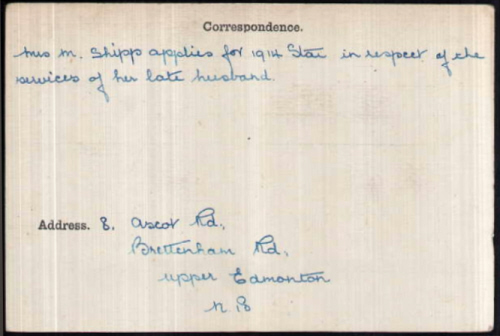 1891 census...Aged 9, he was at 90 Burton End, Haverhill with his father George SHIPP [29] brick maker; his mother Elizabeth [28]; brothers George [12] and John [4]; sisters Phoebe [6] and Sarah [1]. 1901 census... Aged 19 he was in the Grenadier Guards in Windsor. At 8 Lawrence Road, Edmonton were his father George SHIPP [39] a navvy; his mother Elizabeth [38]; brothers George [22] navvy, John [14] navvy and Albert [9]; sisters Kate (Phoebe) [16] cigar factory labourer, and Rose (Sarah) [11] and a visitor Ernest TILBROOK [3]. All were born in Haverhill. Ernest TILBROOK appears to be the son of Sarah Ann TILBROOK who died in childbirth in 1898 and could possibly be the son of George SHIPP junior. Again there can be confusion as 3 Ernest TILBROOK were born around that time in Risbridge. He married Mary GRAVES [26-1-1885] in St Mary's Edmonton on 12th July 1903, they were both aged 21. Sister Kate was one witness. 1911 census...Aged 28, a general labourer, he was at 1 Denhams Cottages, Montague Road, Town Road, Lower Edmonton with his wife Mary [26] born Edmonton; son Henry George [21-10-1903]; daughters Rose Sophia [8-11-1906] and Beatrice [13-11-1910]. Mary had borne 6 children but lost 3 of them. They went on to have 2 more children, Kathleen Laura [28-10-1912] and Alfred Joh [121-11-1914] Brother Albert was now a Private in the 3rd Battalion, Grenadier Guards at St Margaret and St John, London. His parents were now at 43 Folkestone Road, Edmonton with his brothers George (builder's labourer) and John(G.E.R. labourer); sister Rose (machinist in cartridge factory) and Ernest SHIPP[12] who is now recorded as SHIPP, not TILBROOK and son of George (senr) His father's later address was 22 Brettenham Road, Edmonton, his mother having died in 1912. His widow was living at 8 Ascot Road, Brettenham Road, Edmonton when she applied for his 1914 Star. His brother Albert was killed serving in Belgium in the Grenadier Guards in 1914 see here His brother John William also served, enlisting on 5th August 1914,No.TR/4/24852 in the 63rd Training Reserve Battalion, Royal Welch Fusiliers. He seems never to have been fit enough for overseas service. He was discharged at Shrewsbury on 27th September 19i6 by reason of arterial sclerosis and mitral stenosis, congestion of face and hands. The Army deemed him permanently unfit for service but that his ill health was not caused by or aggravated by military service. He returned to live at his father's address 22 Stanley Terrace, Brettenham Road, Edmonton.He was then aged 29. His adopted brother Ernest was killed serving in France in the Royal Irish Regiment see here |