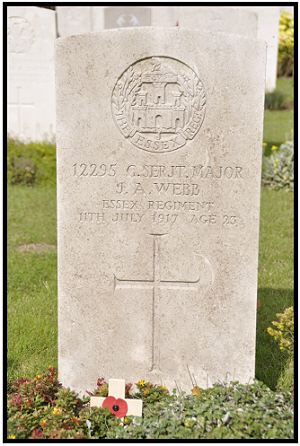 Alf enlisted in the army at Chelmsford and the South-West Suffolk Echo reported on 26th September 1914, that he had joined the 9th Battalion, Essex Regiment with the rank of Lance Corporal and so it seems likely that he had previous military service. He landed in Boulogne on 31st May 1915. He died of his wounds at No.37 Field Ambulance. The South West Suffolk Echo of 28th July 1917 reported that:- "Readers will regret that Mrs.J.A.Webb has this week received official information that her husband, Company -Sergeant-Major James Alfred Webb of the Essex Regt., has died as a result of wounds received in action in France on 11th inst. He was only 23 years of age and was the youngest son of Mr. and Mrs. D.W.Webb, of 26 Vine Cottages, Haverhill. Sergt-Major Webb met his death in the trenches on the morning of July 11th, a bullet entering his head, and he passed away in a few hours without regaining consciousness. He bore a quiet and unassuming manner, and only a fortnight prior to his death he was home on leave. He had only returned to the trenches for two days when he was hit, and about an hour previously he was talking quite cheerfully to Pte. H.V.Scott- who by the way is at present in the town enjoying leave after sixteen months- of the happy times he had spent in this neighbourhood. The late Sergt-Major Webb joined up on the outbreak of war and had been at the front for nearly two and a half years. He had been twice wounded - at Hohenzollern Redoubt and the Battle of the Somme. He was a very popular N.C.O.and was liked by all with whom he came into contact.Prior to joining up he was employed at Braintree Manor Works. Much sympathy will be extended to the young widow and and parents." His Battalion were just NE of Monchy -le -Preux at the time, being heavily shelled. As his service record has not been found it is impossible to be exact as to where and when he was wounded. |