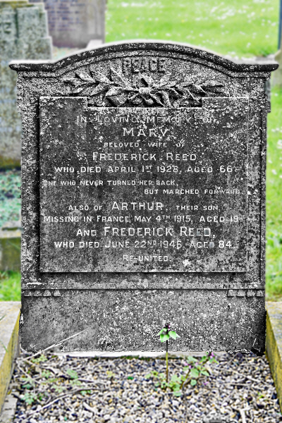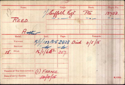 Arthur Reed was born in Isleham on 7th November 1895 (Newmarket Q4-1895 3B:512) and baptised in Isleham on 26th January 1896, son of Frederick and Mary REED