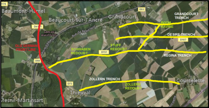 He enlisted in Haverhill when resident in Withersfield. The battalion landed in Le Havre on 27th July 1915 The 7th were the first of the Queen's Own into the Battle of the Somme in July 1916 but suffered badly when fighting at the Schwaben Redoubt. After a spell in Reserve they formed up on 17th November ready for the attack on Desire and Grandcourt Trenches between Twenty Three Road and Stump Road. 7th RWK were in the right centre of the line, between the E Surreys and The Buffs with B and D Coys in front, A in support and C Coy in reserve. The weather had been bad for a month and had changed now to snow and frozen ground. Despite standing out against the white of the snow the attack went over at 6:10 am, they made progress and a determined push saw B Coy into DESIRE TRENCH and established there. The left was however "in the air", D Coy having lost direction and going off to the left. Very few of them got back; the company had gone on over its 1st objective and come under very heavy machine gun fire, the survivors being surrounded and killed or captured. The Buffs and Queens further left suffered in the same way, taking their objective, but going on were cut off by the Germans Major Glare of the E Surreys seeing the precarious position of B Coy sent up all available reinforcements with a Stokes mortar and a bombing party. Assisted in this way B Coy held its ground and even extended and cleared DESIRE TRENCH as far as SIXTEEN STREET. The next morning patrols advancing along DESIRE TRENCH found it had been abandoned. CWGC figures show 45 of the 7th Queen's Own killed in this operation, 20 having no known grave. rough position of trenches November 1916 Commemorated in Kedington Churchyard with his parents click here to go to the Commonwealth War Graves Commission website for full cemetery/memorial details |