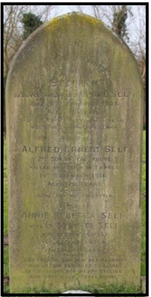 1901 census... Aged 5 he was at High Street, Monks Eleigh with his father Stephen SELF [33] police officer born Wickham Market;his mother Annie R[30] born Mildenhall; brothers Bertie C.S. [6] born Little Thurlow; Frederick J.[3] born Monks Eleigh and sister Elsie V.M. [9 months] born Monks Eleigh. 1911 census...Aged 16 a backhouse boy, he was at Approach Cottages, Withersfield with his parents; brothers Bert C.S. (journeyman baker), Frederick J (milk vendor), Albert E [8] born Sudbury, Sidney A [6] and Stanley G [3] both born in Cockfield; sister Elsie V.M. All seven siblings survived. His parents are buried in Kedington Churchyard (His father died in 1921) and their tombstone also commemorates Alfred. His mother went on to live at 4 Clock House Way, Braintree, Essex. |