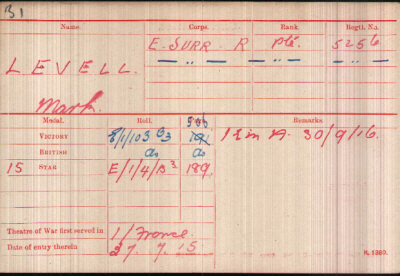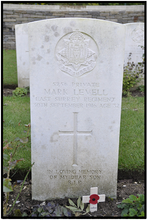 He enlisted in Kirtling. It was just four days after Thiepval was finally taken by the Allies. The 8th East Surreys were tasked with taking the Schwaben Redoubt, this despite being low on numbers. There is a mass of information, far too much for here, on here , the East Surrey war diaries are most comprehensive. 48 of the 69 men of the 8th East Surreys who died that day have no known grave. Mark Levell was found with 2 chums (1 unidentified) and re-interred in Connaught Cemnetery in 1919 |