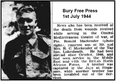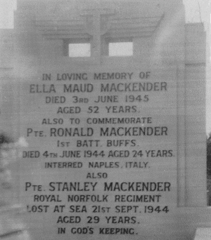 Born in Lakenheath (Mildenhall Q4-1919 4A:1863). Son of Robert Cooper and Ella Maud MACKENDER (née KENT), of Lakenheath, Suffolk. In the 1939 register at The Tap Inn, High Street, Mildenhall were his father Robert [8-3-1889] a labourer/innkeeper; his mother Ella M [10-3-1893]; brother Reginald S [19-4-1913] farm labourer; Marjorie E FLACK [3-9-1928] scholar(possibly an evacuee). His elder brother Stanley died in the Far East :- see here |